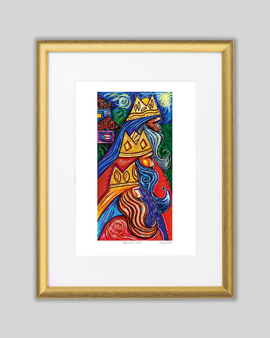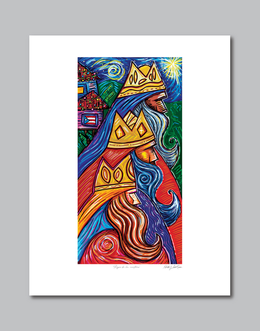 Llenos de ilusiones los tres santos reyes: Melchor, Gaspar y Baltasar llegan a al terruño Borinqueño buscando al niñito de la promesa. Los niños en la ilslita ya duermen con la ilusión de los tres reyes y los presentes que les traerán. En el fondo las casitas alegres con sus aguinaldos campestres y la brillante estrella que alumbra el camino. Llena tu espacio de la navidad puertorriqueña. Impresión digitál sobre papel de hilo.
